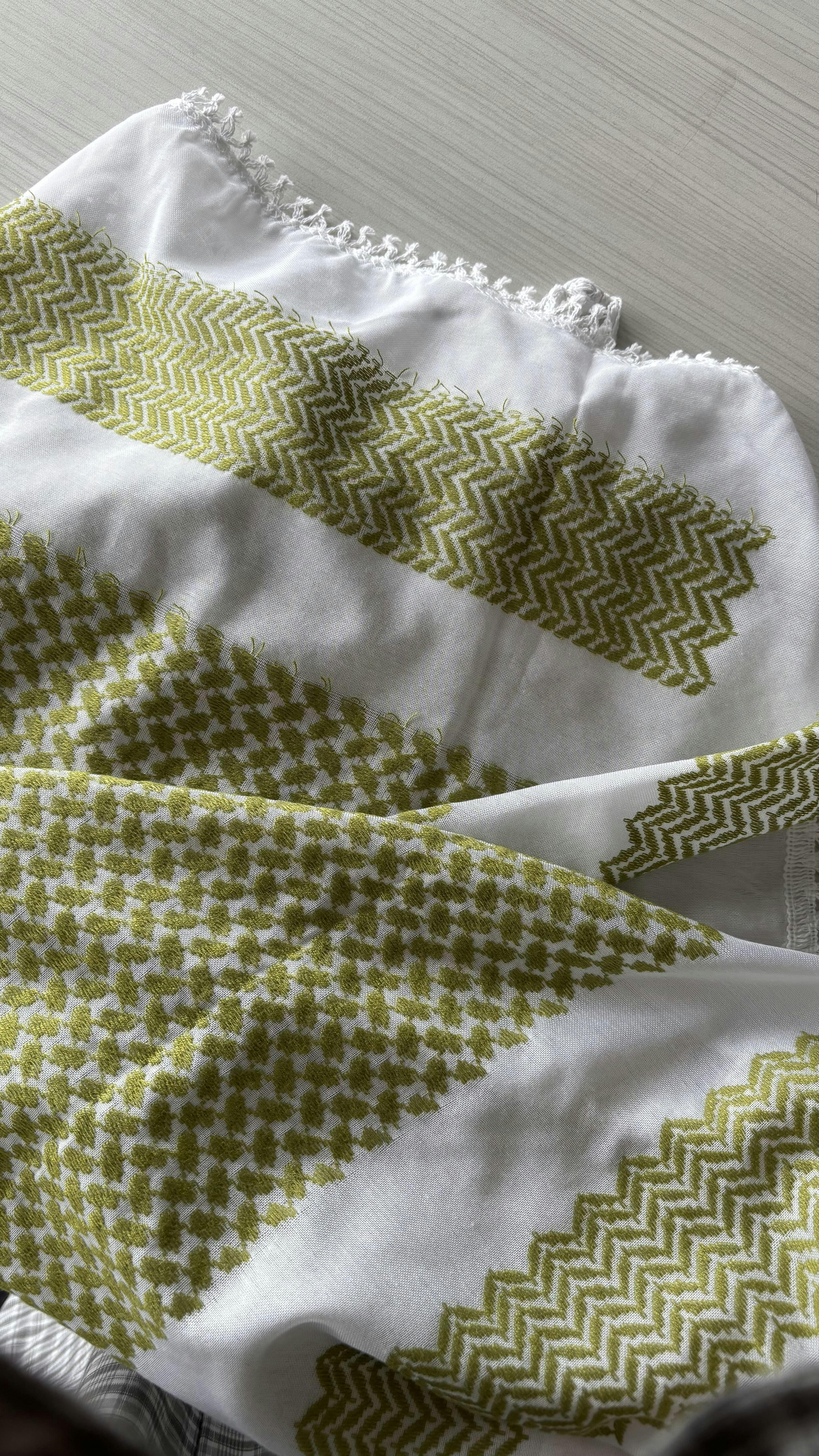 Olive Trees have been critical to the culture and history of Palestine for thousands of years. Known throughout history for its cultivation of the crop, Olives and Palestine are synonymous with each other. The White Olives Kufiyah symbolises the deep connection to the land of Palestine and its people through it’s timeless colour combination.